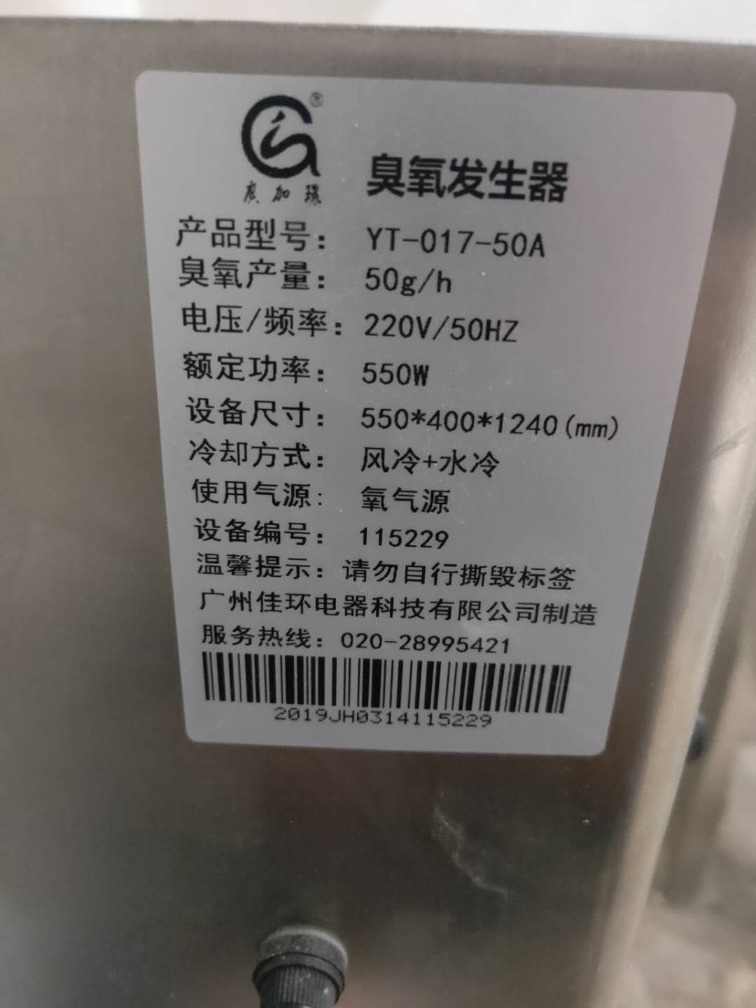 型號:采用50g氧氣源臭氧設備一臺AyR臭氧發(fā)生器_臭氧消毒機_臭氧水機_制氧機_廣州佳環(huán)電器【官網】